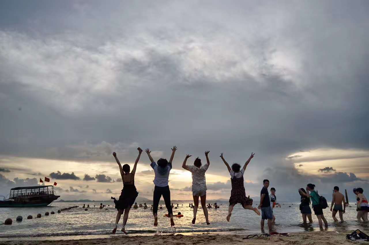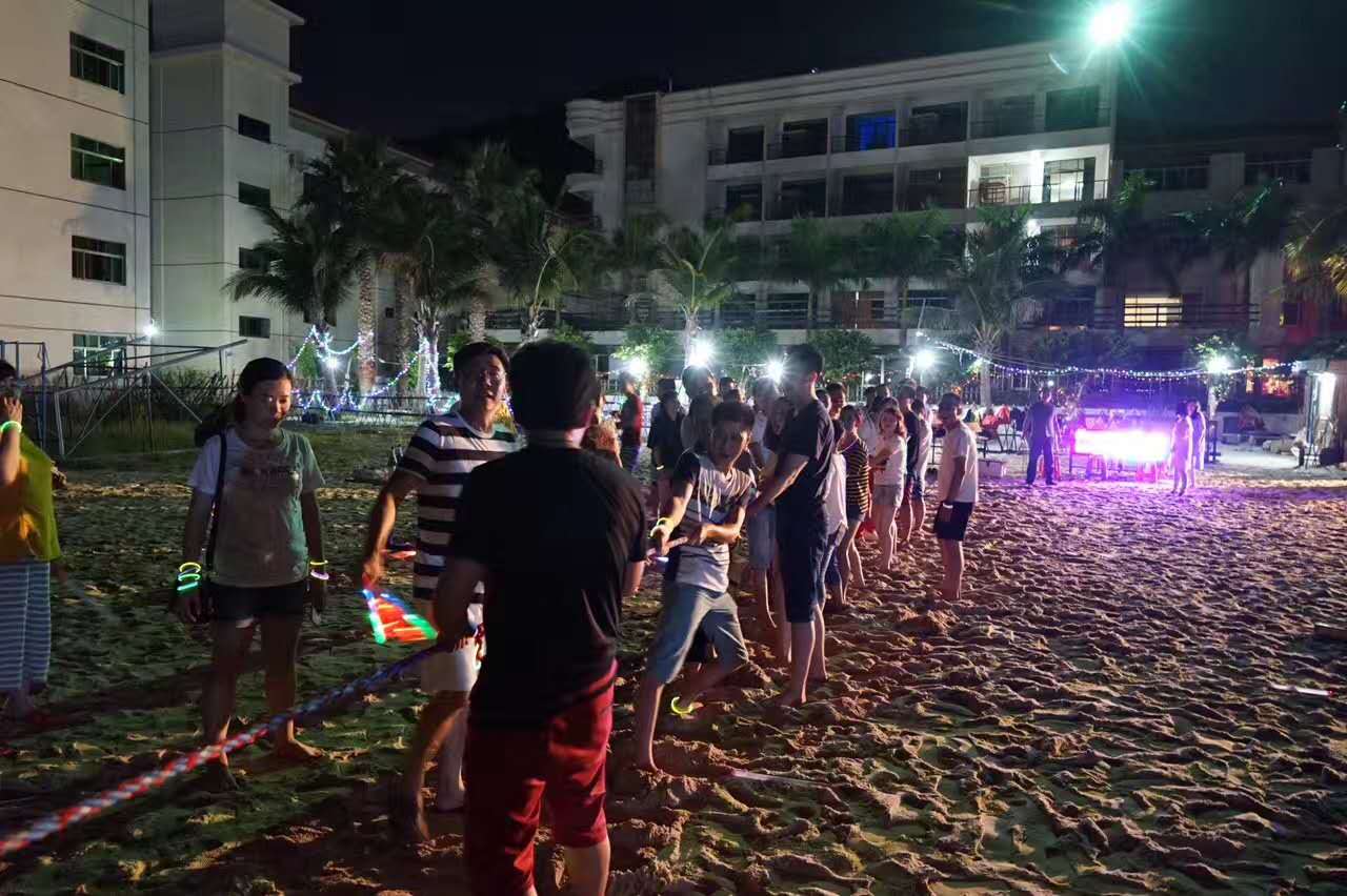 金銀灘沙灘,欣賞海上落日的美景,在沙灘上享用美味的燒烤晚餐,并舉行煙花篝火晚會,大家圍著篝火歡快舞蹈。晚會中進行了拔河比賽,大家分組對陣,摩拳擦掌,熱情高昂,齊心協(xié)力為自己的團隊爭光,吶喊助威的聲音此起彼伏,引得旁人駐足觀看,齊聲為我們的團結(jié)精神喝彩。此外還有兩人三足、踩氣球等游戲項目,大家踴躍參與,玩得不亦樂乎。
