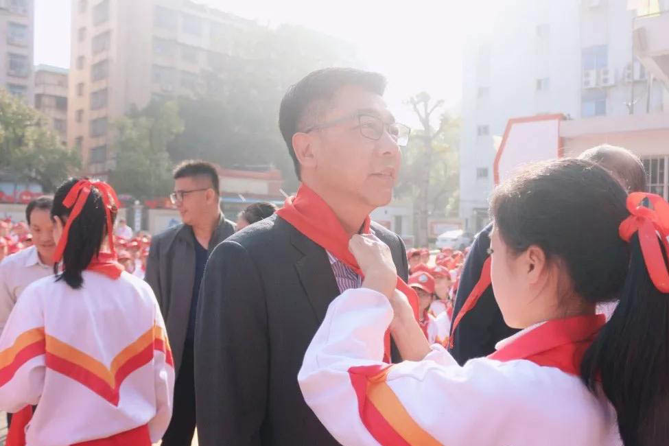 在宣布主題隊(duì)日活動開始時(shí),學(xué)生們?yōu)榧钨e獻(xiàn)上紅領(lǐng)巾,并出隊(duì)旗、唱隊(duì)歌。