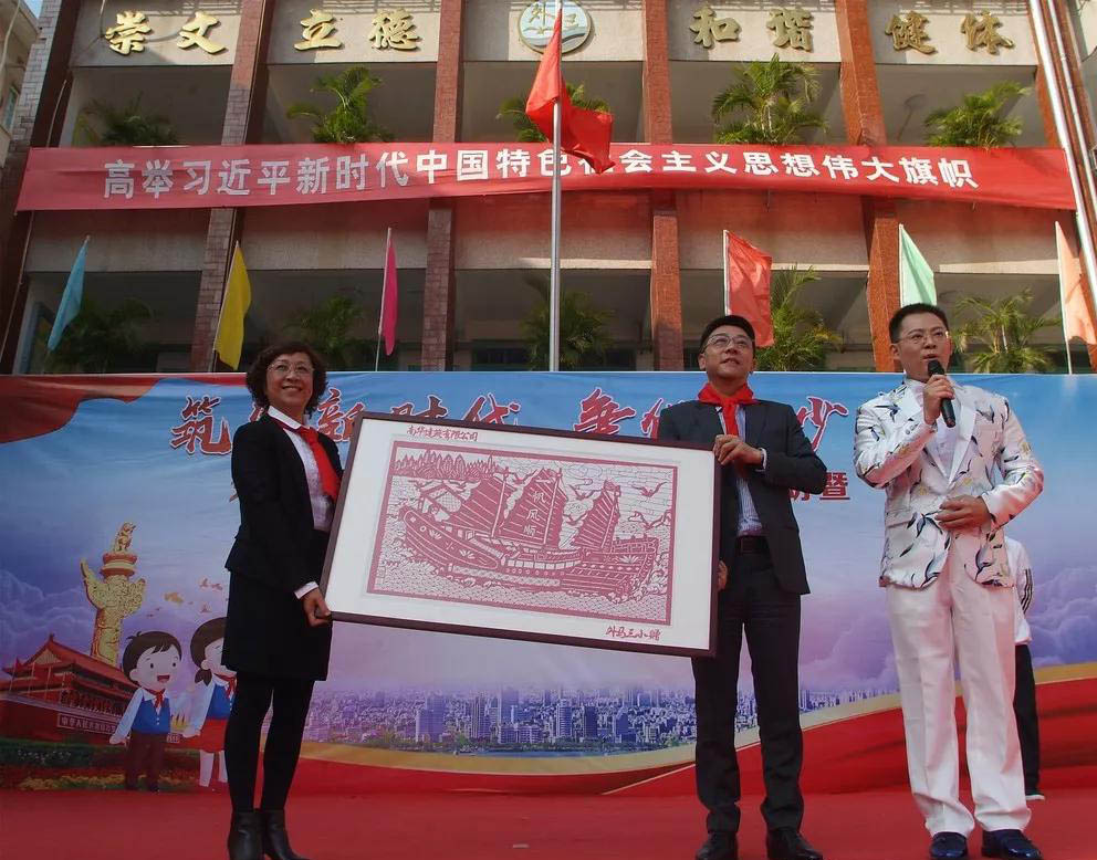 學(xué)校為了表達(dá)對林董事長誠摯的謝意,向我司贈送剪紙作品《一帆風(fēng)順》,這一幅剪紙是由汕頭市非遺傳承人陳小燕老師親自設(shè)計(jì)創(chuàng)作的,馮校長代表學(xué)校贈送作品,表達(dá)對南華公司的美好祝愿。
