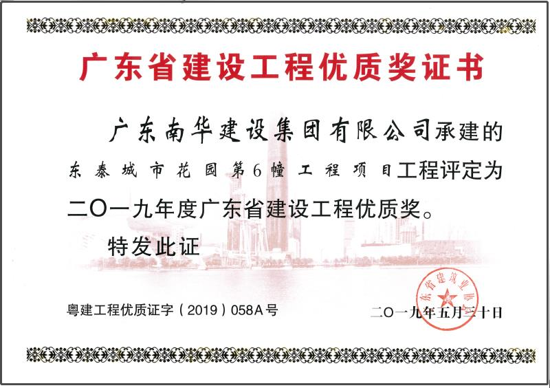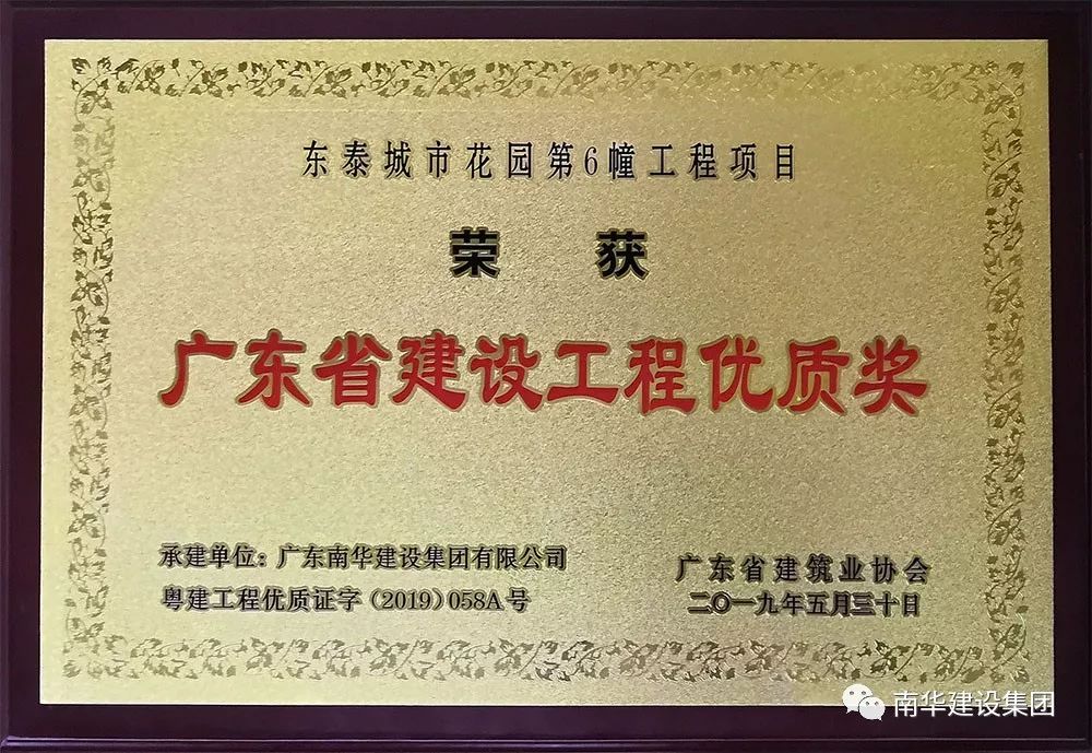 我司一直堅持“科學管理、創(chuàng)時代精品”的理念,不斷創(chuàng)新思路,加強對精品工程施工質(zhì)量的把控,嚴格每道工序的檢查驗收和監(jiān)督管理,一步一腳印,秉持匠心,精工雕琢每一寸建設空間,為美好城市建設和幸福居住環(huán)境留下南華的印記。近日,由我司承建的東泰城市花園第6幢項目獲2019年度“廣東省建設工程優(yōu)質(zhì)獎”,在爭先創(chuàng)優(yōu)的印記上又留下閃亮的一筆。