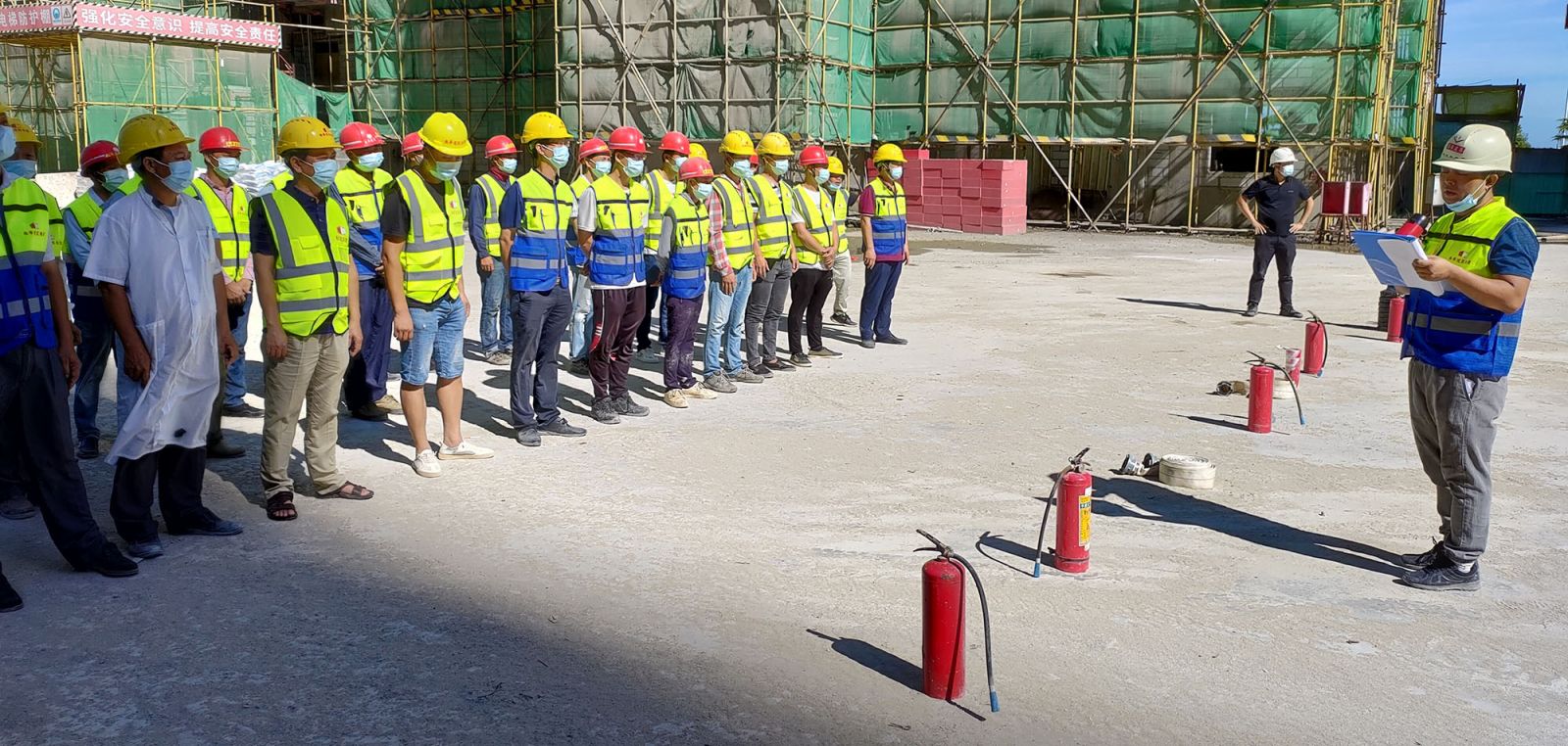 本次消防演練施工現(xiàn)場消防滅火器和現(xiàn)場臨時消防水槍的正確使用方法,隨后模擬對突發(fā)火情進(jìn)行模擬演練,值班人員發(fā)現(xiàn)火情后,迅速啟動消防安全應(yīng)急預(yù)案,并向消防指揮部報告,管理人員和班組迅速到達(dá)火災(zāi)現(xiàn)場,組織開展滅火及救援行動,在演練過程中,各管理人員和班組做到了快速、安全、有序、分工明確的有效措施,充分展現(xiàn)了施工項目“現(xiàn)場指揮組織、事故響應(yīng)、人員撤離、醫(yī)療救護(hù)、現(xiàn)場警戒”等應(yīng)急救援現(xiàn)場的全過程。