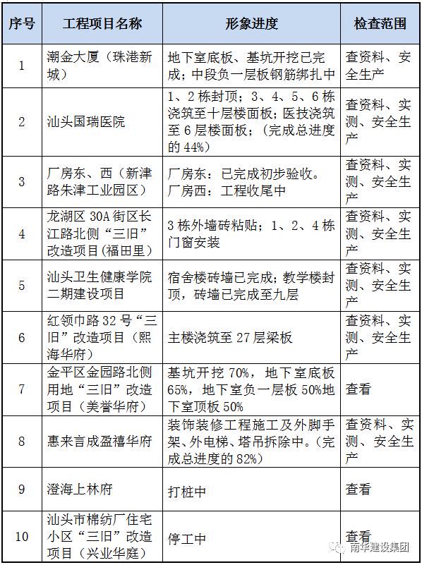 為深入貫徹習近平總書記關(guān)于安全生產(chǎn)的重要論述和重要批示指示精神,認真落實省住建廳、市委、市政府工作部署,扎實開展全市房屋市政工程“安全生產(chǎn)檢查月”及安全隱患集中排查整治工作,進一步提升我市房屋市政工程安全管理水平和能力,根據(jù)《廣東省住房和城鄉(xiāng)建設(shè)廳關(guān)于印發(fā)<2020 年度全省房屋市政工程安全隱患集中排查整治工作實施方案>的通知》、《汕頭市安委辦關(guān)于轉(zhuǎn)發(fā)省安委會印發(fā)的安全生產(chǎn)領(lǐng)域八大專項整治方案的通知》精神,集團公司決定從10月份起至2020年底對公司在建工程開展房屋市政工程“安全生產(chǎn)檢查月”及安全隱患集中排查整治工作專項檢查。