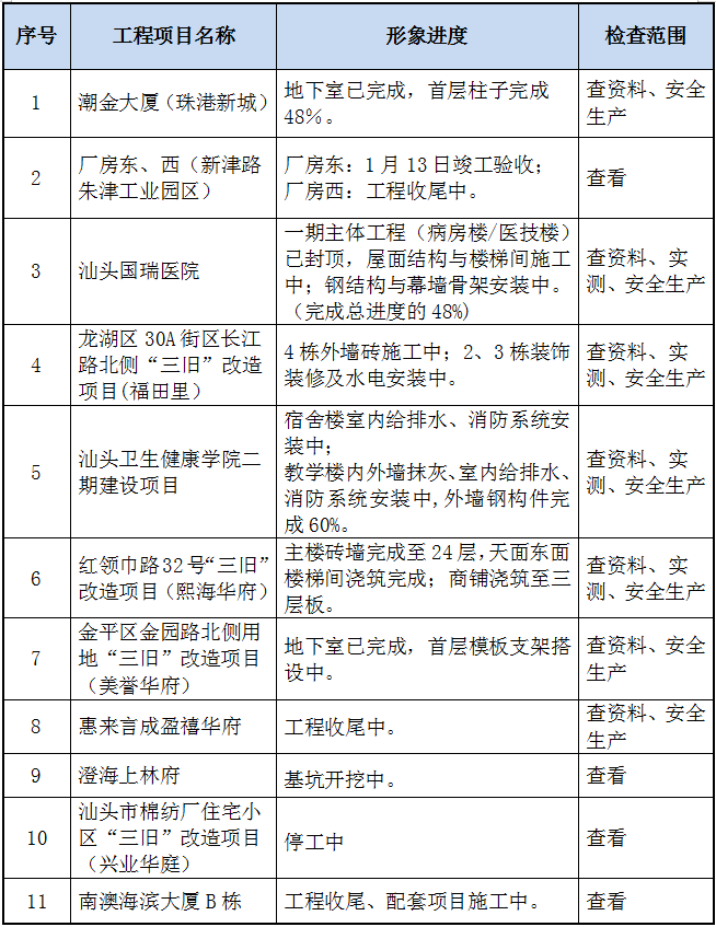 按照集團公司定期檢查部署,公司于3月24日至26日組織了2021年第一季度質(zhì)安大檢查、公司定期檢查及復(fù)工復(fù)產(chǎn)大檢查,檢查共三天。本次檢查,各工地的項目負(fù)責(zé)人能重視,有關(guān)人員能在工地配合檢查,現(xiàn)將檢查情況總結(jié)如下: