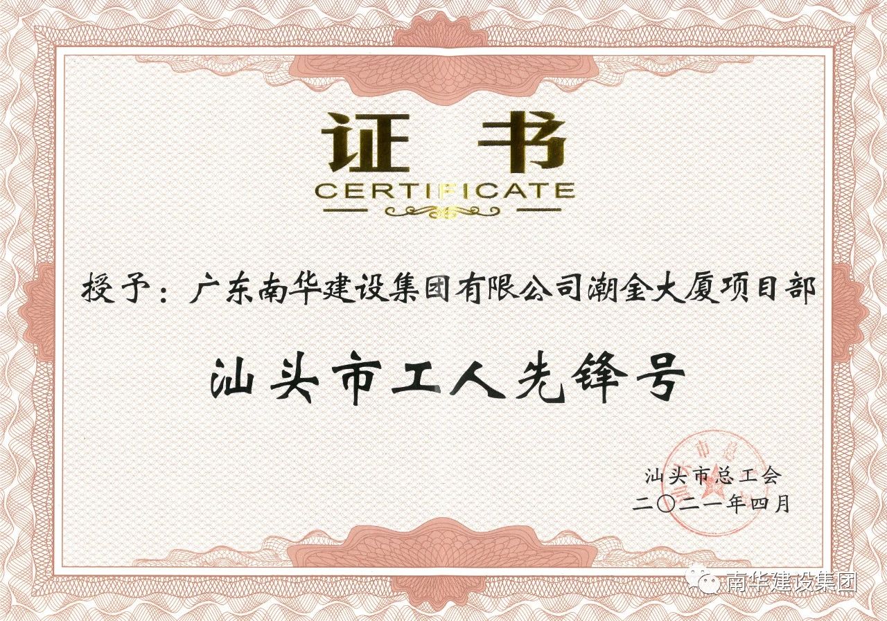 “五一”國際勞動節(jié)來臨之際,4月30日下午,市委市政府在市委會議中心大會堂召開汕頭市慶祝“五一”國際勞動節(jié)大會。南華建設(shè)集團“潮金大廈項目部”榮獲汕頭市 “工人先鋒號”稱號!潮金大廈項目部在公司領(lǐng)導(dǎo)班子和公司工會的帶領(lǐng)下,一直秉承“科學(xué)管理、創(chuàng)時代精品;誠信服務(wù)、讓客戶讓客戶滿意”的質(zhì)量方針與“以質(zhì)取勝、信守合同”的企業(yè)精神,以精細化管理規(guī)范自己,以標準化建設(shè)要求自己,團結(jié)奮進,銳意改革,狠抓建筑質(zhì)量與優(yōu)質(zhì)服務(wù),高效完成各項生產(chǎn)工作任務(wù)。2020年2月獲“汕頭市合格職工之家”稱號,2020年7月獲“汕頭市金平區(qū)先進集體”稱號。